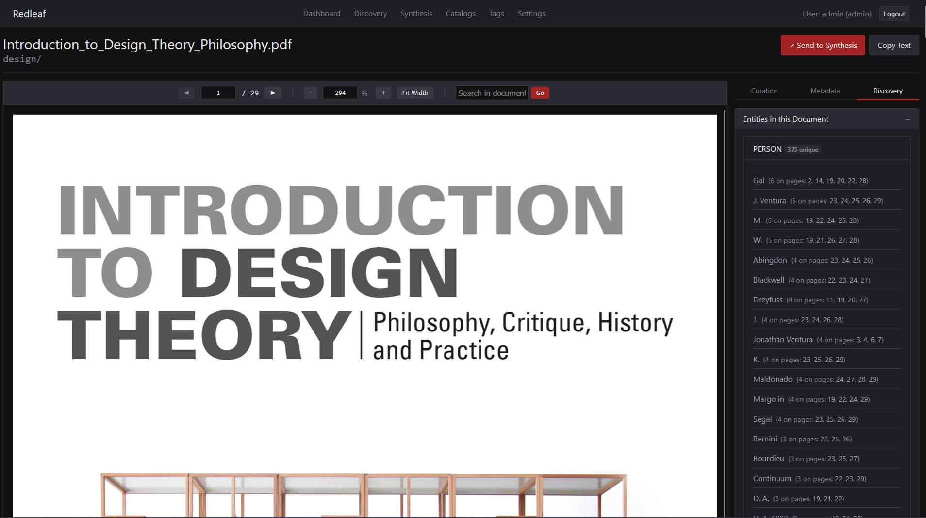 Redleaf 1.0 already used spaCy to extract people, places, and organizations. In 2.0, browsing that information is much faster. On the side of every document there is now an integrated indexing tab showing every detected person, place, and thing—making it much easier to navigate documents at a glance.