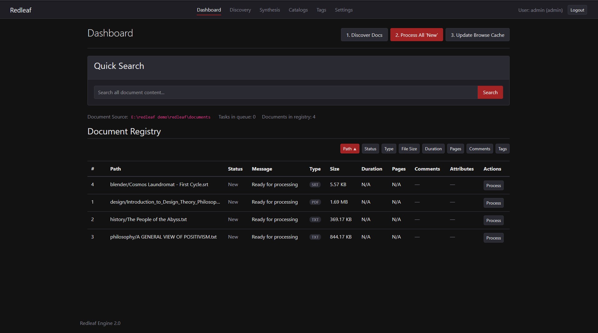 Because this runs in the background, you can continue to browse and use the Redleaf interface while your documents are processing.
